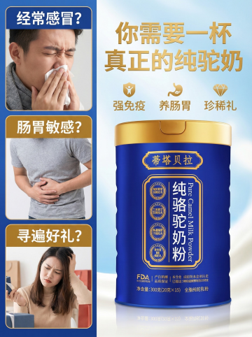 要点:品牌/产品名 + 核心价值主张 + 高质感产品图。 纯驼奶粉应用: 场景:广袤纯净的沙漠或牧场背景,突出“自然、稀缺”感。 文案:大字突出 “100%纯驼奶”、“配料表只有生驼乳”、“源自黄金牧场”。 视觉:产品主体突出,光泽感好,可搭配一小杯冲调好的奶液,表现“纯净乳白”。