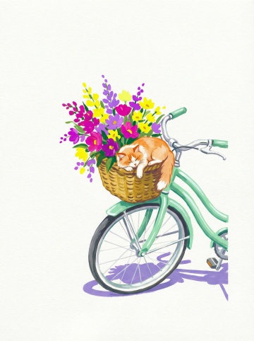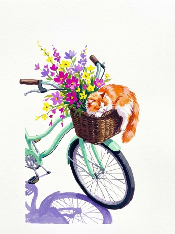 水彩风插画,白猫戴红蝴蝶结坐于花丛,拟人化设计,清新梦幻,传递春日温暖与童趣。