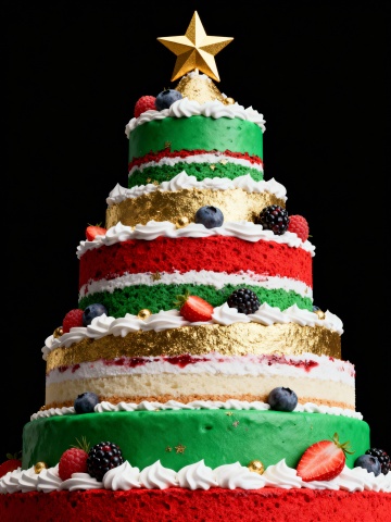 以蛋糕层叠成圣诞树,用红绿奶油配金饰、鲜果,将甜品与圣诞形态结合,既契合节日甜蜜氛围,又打造出美味又吸睛的创意装饰