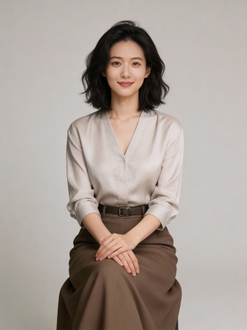 保留人物脸型、发型、年龄特征生成标准职场形象照,50MM焦段,F/4光圈(F/2.8-F/4区间),相机与人物距离3米,横向16:9比例(左右预留环境空间),人物占画面60%,入镜头部至膝盖上方5CM,平视视角,人物居中构图,头肩比例协调,身穿深墨蓝色西装,内搭白色衬衫,精致且高级的深蓝色斜向微微渐隐光泽感极细条纹商务感领带,下装黑色西裤搭配黑色皮带;正面抱胸姿态,肢体舒展的站立姿态,自信从容;主