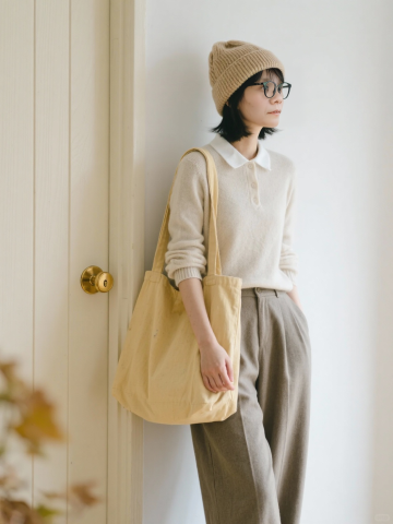 东亚风简约穿搭,柔和色调与天然面料交织,营造舒适质朴的杂志感实景画面。