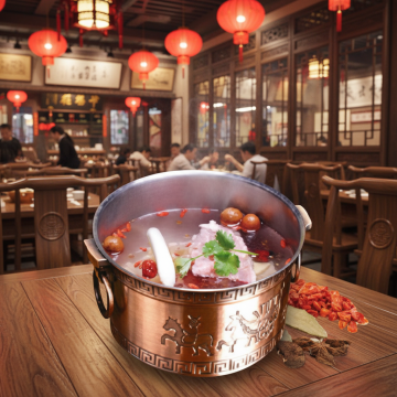 热气腾腾的鸳鸯火锅冒着浓郁香气,锅中翻滚着鲜红的麻辣汤底和清亮的菌汤,周围摆满肥牛卷、虾滑、毛肚、青菜等各色食材,木质餐桌上铺着传统花纹餐布,背景是古色古香的中式屏风和红灯笼,营造出温馨热闹的火锅盛宴氛围,整体呈现出温暖诱人的色调和丰富的层次感,充满地道的中式火锅文化气息。