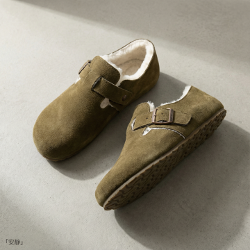 布局结构: 产品占比:60%(居中偏下位置) 背景:浅米色棉麻质感背景 元素:单只鞋子45度侧放,自然光影 细节:左下方10%区域添加小字“真皮牛反绒 | 雪花绒内里” 色调:低饱和度暖灰色系