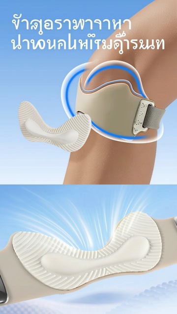 这是我的tiktok小店正在售卖的一款硅胶气囊髌骨带,主要售卖国家是泰国,我现在需要至少8张图片来介绍这个产品,促使顾客下单,产品卖点:缓震解压,V型防护,贴合髌骨弧度,有8mm气囊,对膝盖有缓冲保护,导热排汗,减少闷热感。我的要求是:展示产品的使用场景,展示产品的材料细节是透气不闷,8mm气囊减少关节挤压,有32cm毛毡魔术贴,可以自由调节长度适合各种腿围,数和髌骨保护,韧带保护等,适合户外活动等场景。语言用泰国语,并符合当地民众的阅读习惯。产品样子不要改变,如果你是一名资深的tk跨境电商运营,会怎么设计这些图