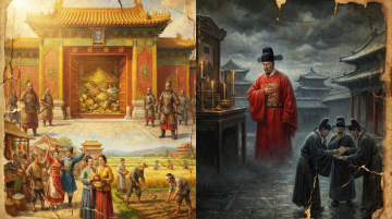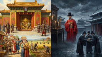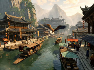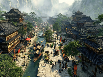 中式古典场景,3D重拟物风呈现古代城建实景,水墨与岩彩元素融合,人物服饰考究,展现先民筑城劳作的生动画面。