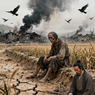 灰暗色调的3D重拟物风画面,油画质感渲染灾后废墟,干油墨风细节强化沉郁与严峻,实景感十足,乌鸦盘旋中透出强烈故事冲击。