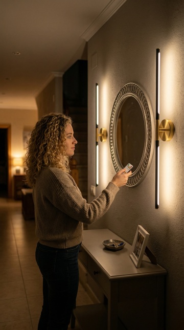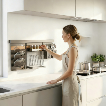 一个明亮整洁的现代厨房,采用简约优雅的设计风格,以白色为主色调,搭配黄铜色金属装饰细节。厨房整体呈现出温馨舒适的氛围,阳光透过百叶窗洒入,在白色橱柜和大理石台面上形成柔和的光影效果。白色的橱柜带有黄铜色的圆形拉手,上方的吊柜和下方的地柜组合提供了充足的储物空间。大理石台面光滑洁净,带有自然的灰色纹理。台面上有一个双槽不锈钢水槽,搭配黄铜色的水龙头。水槽旁边的金属桶里插着木质的锅铲和汤勺。墙面安装着黄铜色的挂杆,上面挂着各种木质和金属材质的厨房用具,包括勺子、铲子等。挂杆上方的白色搁板上摆放着不锈钢和玻璃材质的储物罐,里面装着各种香料和食材。台面上还摆放着一个白色的盘子,里面放着几块叠在一起的三明治,旁边还有一盘色彩鲜艳的沙拉。整体构图采用了三分法,光线从左侧窗户进入,营造出明亮通透的感觉,细节丰富,质感细腻,展现出干净利落的现代厨房设计感。