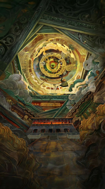 鎏金工笔绘中式宫门,月满中天映静水,水墨浮雕意境交融,典雅唯美的中秋贺图。