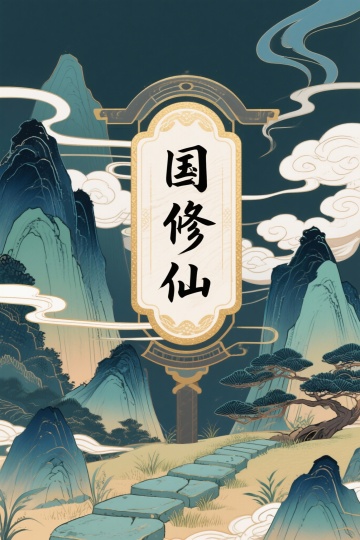 水墨风与工笔细腻结合,古典中式建筑隐于山水之间,鎏金细节点缀静谧意境,紫鸢尾花与竹筏呼应自然诗意,插画风格营造唯美感与文艺气息。