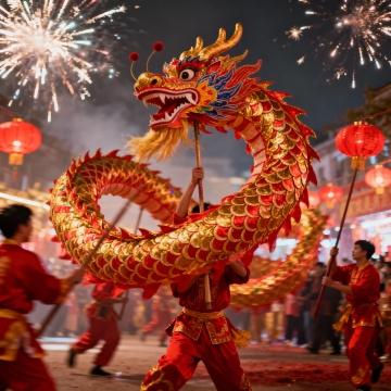 国潮风市集,毛发生长风装饰的自行车与梦幻粒子飘动,喜庆红灯笼与卡通虎纹围裙交织中式感,轻拟物风呈现节日欢乐氛围。
