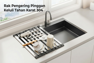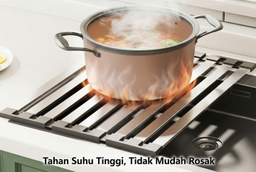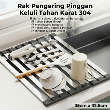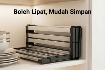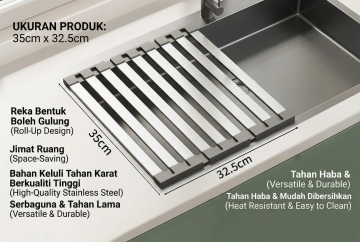 这是我的tiktok小店正在售卖的一款沥水架,主要售卖国家是马来西亚,我现在需要1张电商主图来吸引顾客点进链接购买产品,促进店铺销售,产品卖点:304不锈钢材质,无毒无害,承重能力强,抑制有害细菌滋生,奈高温抗腐蚀,重量轻,可折叠,便于存放。我的要求是:展示产品的使用场景,沥水架作为主角不要被抢,可以单独展示。语言用马来语,并符合当地民众的阅读习惯。产品样子不要改变如果你是一名资深的tk跨境电商运营,会怎么设计这些图