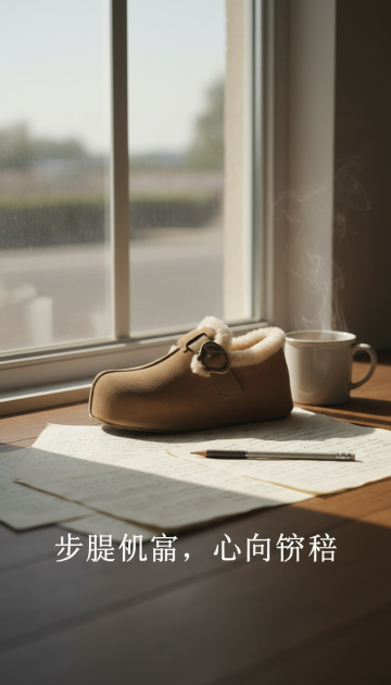 视觉: 场景:清晨的书房窗台 构图:一束柔和的晨光斜射 主体:鞋子安静置于打开的笔记本旁 细节:笔记本上有一行手写体(钢笔字迹) 画面比例:鞋子占35%,环境占65% 文案(手写字体逐字显现): “愿你走过的每一步 都通往 更自在的自己” 氛围音(想象): 翻书声、远处鸟鸣 色彩基调: 主色:晨雾灰 #E8E8E8 辅助:羊皮纸白 #F7F3E8 点缀:干枯玫瑰粉 #C4A48F(极少量)