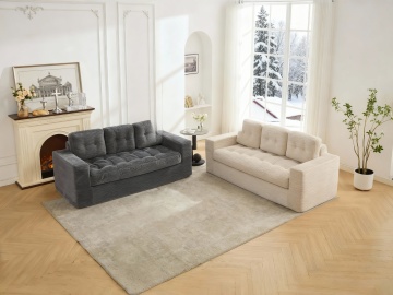 明亮柔和的自然光洒满整个空间,采用极简北欧风格设计,以米白色、浅木色和原木色为主色调,温暖而治愈的氛围。画面中展示的是一个变换了不同家具环境的客厅,整体构图保持对称美学与开放式布局,光线从左侧窗户斜射进来,在浅色木地板和条纹地毯上形成清晰的光影层次。墙上挂着两幅简约线条的植物装饰画,搭配原木边框。左侧有一盏弧形黄铜落地灯,灯光柔和,旁边摆放着一盆绿植。中央是一张浅灰色布艺沙发,搭配几个不同纹理的浅色系靠垫,沙发前是一张原木色茶几,上面整齐摆放着几本书籍和一个小巧的陶瓷花瓶。整体画面质感细腻,线条简洁流畅,空间通透,营造出舒适、宁静且温馨的居家氛围。