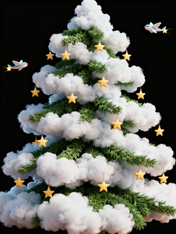 梦幻3D风圣诞树,云朵与松枝交织,金星点缀,卡通飞鸟穿梭,粒子光效营造温馨趣味的虚拟自然节日氛围。