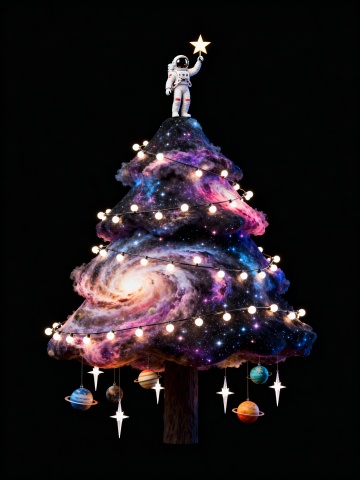 宇宙星云构成的圣诞树,宇航员顶星点亮节日,融合未来感与梦幻科技风,3D超现实设计,霓虹粒子点缀,营造神秘酷炫的虚拟现实圣诞氛围。