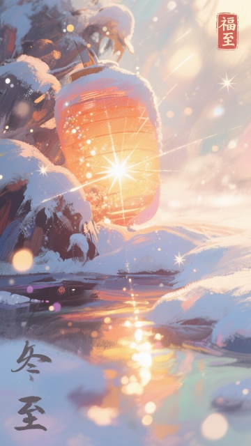 冬至夜雪落庭院,水墨笔触勾勒“冬至”大字,红灯笼映暖光,家人围坐包饺子,剪纸窗花透温情,国潮风韵中尽显中式复古与喜庆温馨。