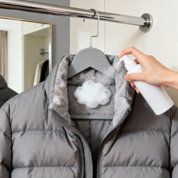 性冷淡风简约空间,柔和光影洒落木质地板,清透窗景映衬静谧冬日,衣物自然垂挂,营造舒适面料质感与实景般的宁静氛围。