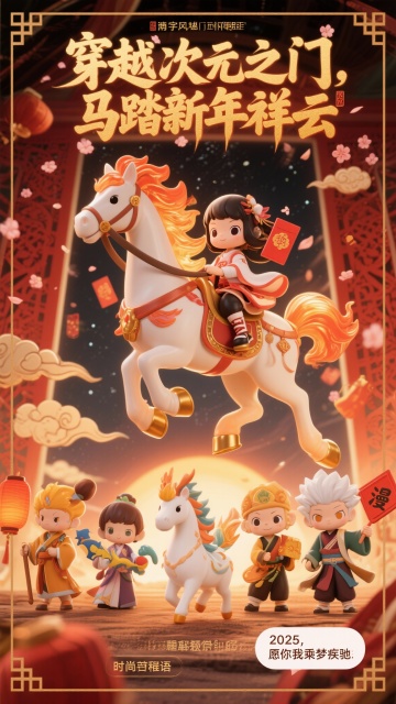 国潮风软3D卡通形象,鎏金粒子点缀,梦幻喜庆氛围,萌趣角色骑马踏云,传递新年祥瑞祝福。