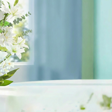 极简主义水彩风格室内场景,柔和的灰蓝色墙面,白色透光纱帘垂落于窗框两侧,窗外是淡蓝色天空与稀疏白云,窗边浅木色腿白色抽屉柜上摆放透明玻璃花瓶,插满白色花朵,地面铺浅灰色地毯,整体色调清新淡雅,光线柔和明亮,营造宁静通透的氛围,线条简洁流畅,色彩晕染自然,保留水彩特有的轻盈通透质感与微妙笔触纹理。