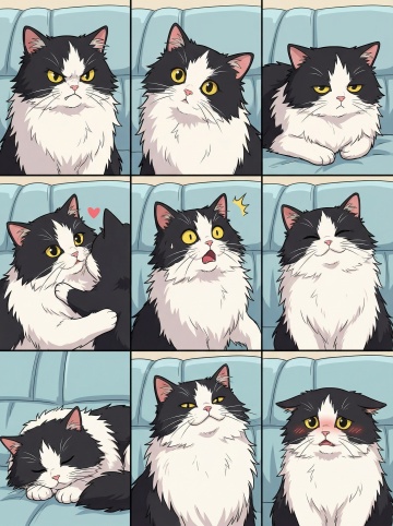 一组6个同系列素材集合,每个元素均为同一只布偶猫,保持其蓬松雪白长毛、渐变浅灰棕色耳朵和尾巴尖、天蓝色杏仁状大眼睛、粉鼻头及粉红色肉垫的核心特征,整体画面采用统一的浅粉色纯色背景,延续原图像的超写实摄影风格,细腻捕捉毛发的纹理质感与光泽,柔和的自然光从上方45度角照射形成轻微阴影增强立体感;6只布偶猫分别呈现完全不同的造型与角度:1. 正面坐姿歪头看镜头,2. 左侧卧姿舔舐爪子,3. 站立伸懒腰,4. 背面蹲坐尾巴圈成圆形,5. 右侧躺露出肚皮,6. 趴在地面前爪交叠抬头望向上方;6个元素以2行3列的规整网格形式排布,彼此间距均等,整体构图平衡对称,确保色彩统一、风格一致且信息传达清晰。