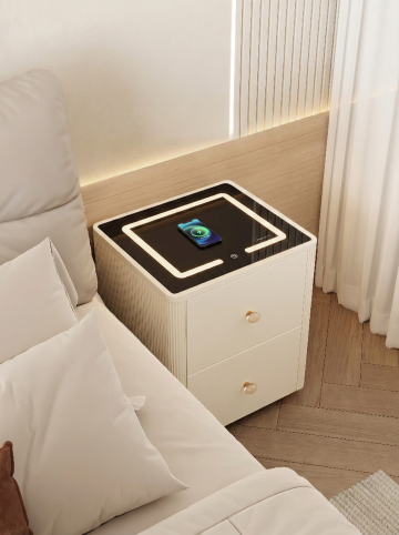 暖光轻雾萦绕,木雕风床头柜上简约加湿器静置,柔光透帘,营造冬日温馨实景感,轻拟物设计呼应自然舒适。