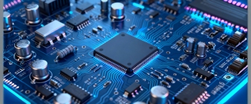 3D渲染风格的科技感背景,以深蓝色与黑色为主色调,中央是一块散发着明亮蓝色光芒的方形芯片,芯片边缘有蓝色灯带环绕,周围布满精密的黑色电路板和各种电子元件,电路板上点缀着蓝色和橙色的发光小点,整体呈现出强烈的金属质感和科技氛围,光影效果突出,高光与阴影对比鲜明,营造出深邃而神秘的未来科技感,画面构图聚焦于中央芯片,四周元件有序排列,具有良好的视觉引导和层次感。