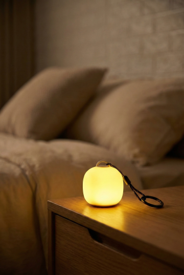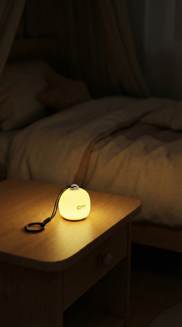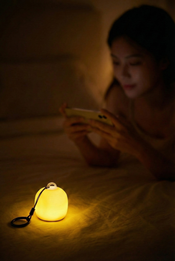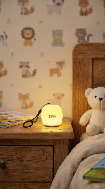 从床头柜的视角看过去,一盏参考图中的捏捏灯亮着柔和的黄色光。不改变捏捏灯的形状,它的光芒洒向旁边床上熟睡的孩子,孩子的脸上带着微笑。整个房间光线昏暗,只有捏捏灯的光芒是亮点,背景人物虚化,主体为捏捏灯