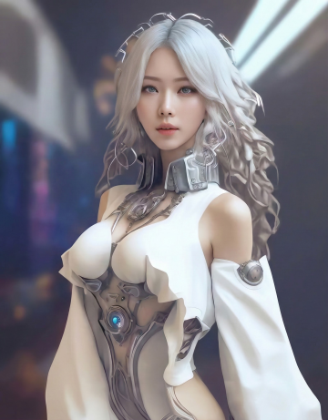 赛博朋克风机械女性,融合未来感与科技感,金属机身搭配霓虹灯背景,3D重拟物设计展现机能美学。