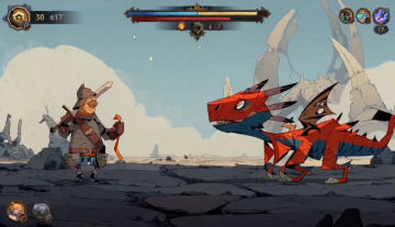 卡通感十足的动漫风战斗场景,漫画式夸张动作与虚拟现实质感结合,荒漠背景中骑士与红龙激烈对决,充满戏剧张力。