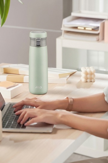 现代感办公场景,清新舒适,性冷淡风设计,轻拟物风水杯点缀,简约时尚。