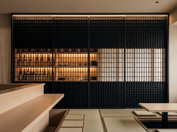 温馨雅致的日式居酒屋餐厅内部场景,原木色与暖棕色为主色调,柔和的暖黄色灯光从木质格栅灯罩中洒下,照亮深色实木餐桌与黑色皮质座椅,墙面装饰着浮世绘风格的木质版画,吧台区悬挂着日式灯笼与复古酒瓶,角落摆放着大型绿植与竹编屏风,地面铺设深色防滑榻榻米纹理地砖,整体营造出古朴静谧又不失现代舒适感的用餐氛围,空间布局开阔通透,桌椅排列整齐有序,细节处点缀着日式传统纹饰与暖光小摆件。