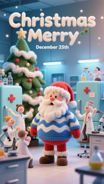软3D粘土风格圣诞场景,卡通感十足的圣诞老人与装饰树,搭配悬挂雪花与星光,营造梦幻温馨的节日氛围。