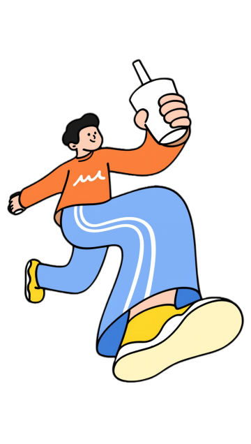 卡通感十足的扁平风插画,清新可爱,人物奔跑姿态充满趣味,搭配柔和色彩与简约植物背景,传递轻松愉悦的日常氛围。