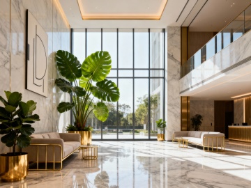 现代简约风格的高端酒店外观,黄昏时分,温暖的橙黄色灯光从建筑内部透出,照亮带有水平线条的米棕色石材与木质装饰立面,宽敞的入口门廊有整齐排列的嵌入式灯带和支撑柱,门前停放着几辆轿车,周围环绕着绿树,天空呈现从浅蓝到粉紫的渐变暮色,建筑整体采用对称布局,具有清晰的垂直与水平线条结构,光影对比柔和,营造出宁静而奢华的氛围。