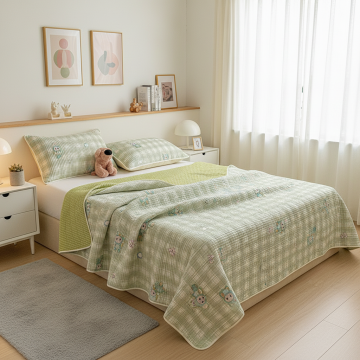 根据图中床品内容 生成新的现代温馨明亮卧室场景 增加一名中国女性模特