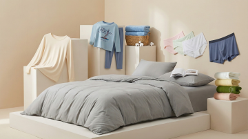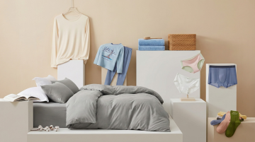 性冷淡风简约空间,柔和光影洒落木质地板,清透窗景映衬静谧冬日,衣物自然垂挂,营造舒适面料质感与实景般的宁静氛围。