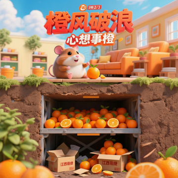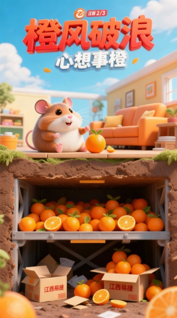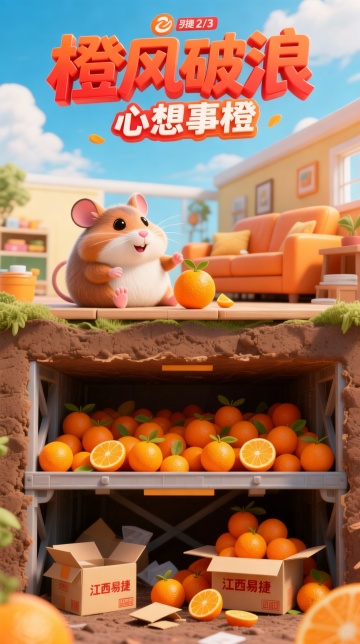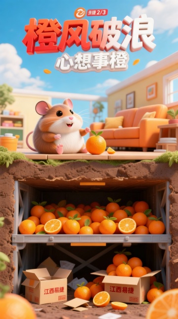 软3D风格橙子拟人形象,鎏金质感文字搭配卡通场景,突出11.11促销氛围,强化可爱与体积感,传递节日狂欢与限时优惠信息。