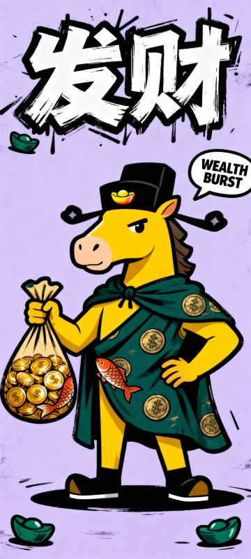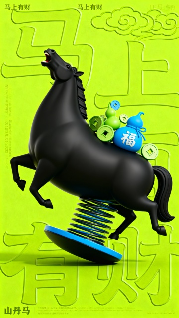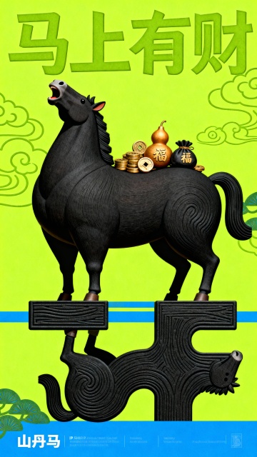 这是一幅融合压纹工艺马主题艺术设计,夸张图形构建1匹旋转倒立的马(撑满画面的以山丹马为原型设计马年IP形象,摒弃所有琐碎细节,用极简线条与基础几何形态构成黑棕色奔跑马,完整姿态,姿态俏皮,马头仅占身体比例的1/8),仰天长啸,极度夸张的流线型肥胖身躯完全占据画面(突出形成视觉节奏,避免单调。马背驮着铜钱、葫芦、福、钱袋等,背景为大字笔划为云纹体的字“马上有财”下,色彩策略:高饱和碰撞 + 符号化呼应,强对比抓眼:荧光黄背景与暗紫马匹形成极具冲击力的视觉反差,瞬间抢占注意力;符号色表意:蓝、绿点缀色分别对应传统吉祥寓意(蓝显贵气、绿寓福禄