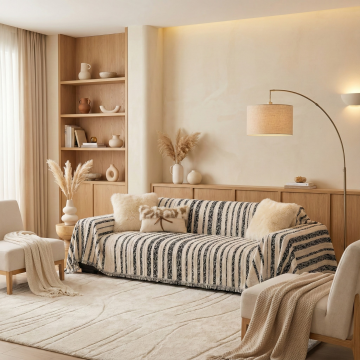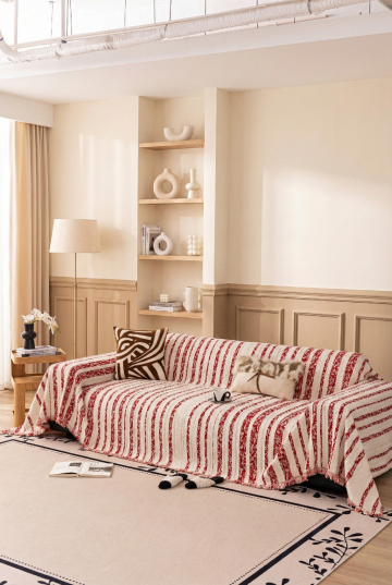 生成三张场景图 产品是图中的沙发巾,场景展示可以是多角度的 要求保留沙发巾的材质细节,场景可以是奶油风的客厅背景,可以是阳台的沙发展示,或者室外露台 凉亭的沙发巾展示 比例1:1