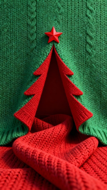圣诞毛衣堆叠成树,融合面料风与拟人化设计,波普艺术色彩碰撞,营造喜庆温馨的节日氛围。