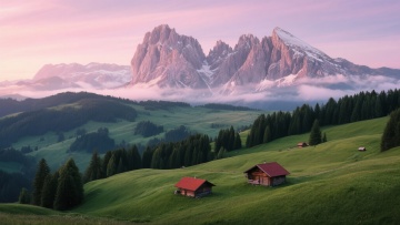 全景镜头,在被晨雾温柔笼罩的隐秘山谷中,翡翠色的草甸如波浪般起伏延伸,轻薄的乳白色雾气在草叶间流动缠绕,仿佛大地正在缓缓呼吸。一条银色溪流如时间的脉络蜿蜒穿行其间,水面倒映着紫粉色渐变的朝霞与靛青色的远山轮廓,形成虚实交织的双重梦境。两岸点缀着无数露珠闪烁的白色小花,每一朵都像是被晨雾吻过的星辰。远处山峦在玫瑰金色的晨光中若隐若现,空气中弥漫着湿润的草木清香与泥土芬芳。光线柔和得如同被丝绸过滤,既保留了3D渲染的精致细节——草叶的纹理、露珠的折射、水面的微澜,又透着水彩画般的诗意朦胧。整体色调呈现青绿色草甸与玫瑰金霞光的绝美渐变,营造出神秘而又充满希望的黎明之境,仿佛世界在此刻刚刚苏醒,一切皆有可能。