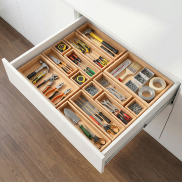 制作这个收纳柜电商的场景图,把它放在明亮温馨的厨房白色桌柜的抽屉里,棕色的木质地板,白色抽屉里收纳柜里添加着工具用具,例如,木质手柄的不锈钢锅铲,木质手柄的不锈钢汤勺,不锈钢刀,罐装的香料,银质刀,银质叉,勺子,打蛋器,油刷,擀面杖,剪刀,刨丝器。可以看见抽屉内部的收纳柜,整体画面协调完美,摆放饱满整齐,收纳舒适,8k超清,细节完美,从上往下的拍摄角度