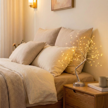 极简风格卧室室内设计,以浅米色墙面为背景,搭配原木色实木床架,铺着浅灰色亚麻质感床单,床头摆放两个浅米色方形靠枕和两个浅灰色长条形枕,床尾随意搭着一条米白色针织毯。床的左侧是原木色床头柜,上面放置一个白色陶瓷小花瓶,插着几根干枝,旁边有一个白色小茶杯和托盘。床头柜上方墙面挂着一幅极简风格装饰画,画框为原木色,画面是三束黑色线条勾勒的麦穗图案。床的右侧是一盏白色金属落地灯,灯罩为米白色布艺材质。床前浅色木地板上铺设一块米白色长方形棉麻地毯,地毯上放着一个圆形编织篮,篮子里有一本翻开的书。整体色调以米色、浅灰、原木色为主,光线柔和,营造出宁静、舒适、简洁的氛围,空间布局对称平衡,线条干净利落,无多余装饰,体现极致的简约美学。