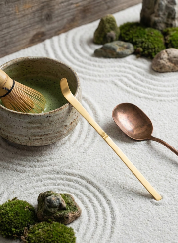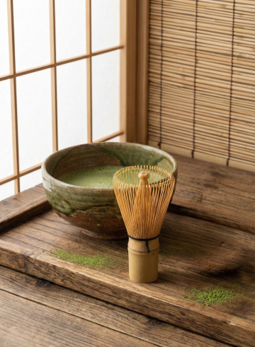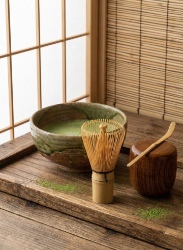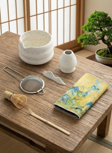 水墨山水屏风映衬青瓷茶杯,木雕托盘与干茶叶点缀,静谧质朴中透出古典中式韵味,实景质感十足。
