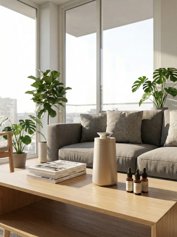 极简主义室内场景,浅米色哑光墙面,自然光从左上角斜射形成柔和光影,右下角放置一盆深绿色绿植配浅棕色哑光花盆,地面为浅色实木地板,纹理清晰,拼接整齐,表面光滑有自然光泽,整体营造宁静、简约、温馨的居家氛围。