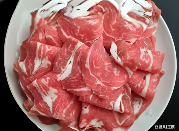 一盘新鲜的生牛肉片,牛肉片被精心卷成玫瑰花造型,摆放在黑色的圆形盘子中,牛肉呈现出鲜艳的红色,纹理清晰可见,肉质鲜嫩,盘子边缘点缀着几片绿色的香菜叶,整体画面简洁干净,背景为纯白色,突出牛肉的新鲜和质感,光线明亮柔和,从上方均匀照射下来,使牛肉的色泽更加鲜亮,阴影细节自然,展现出食材的原汁原味和精致的摆盘艺术。