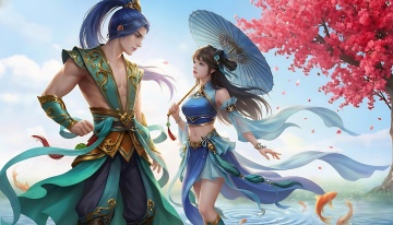 古典中式插画风,水墨山水背景,人物手持折扇,尽显雅致韵味。