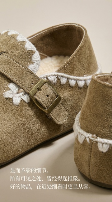 构图布局: 产品占比: 严格遵守60%,鞋子呈自然放松的斜向摆放。 背景: 一张老旧但干净的原木色书桌一角,有一本摊开的、纸张微黄的书籍或笔记本。 元素: 鞋子置于书页前方或旁边,书页上可能有一支简单的木质铅笔或一副细框眼镜。画面大量留白,光线是柔和的侧光,产生细腻的质感。 文案: 仅在画面左下角或右上角,用纤细、非衬线字体写:步履间,自有答案。 视觉目标: 第一时间建立“知识分子风”和“安静质感”的联想,突出鞋子的氛围而非堆砌卖点。