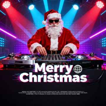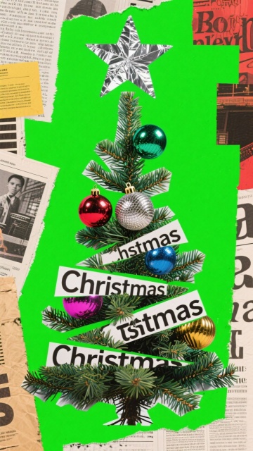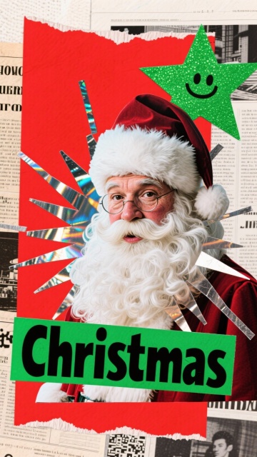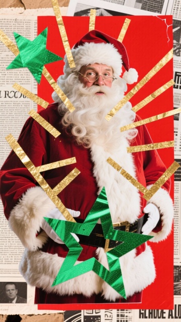 喜庆红底,撕纸风圣诞老人,拼贴金箔射线与绿星,波普艺术撞色,节日氛围跃然纸上。