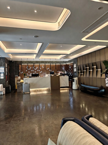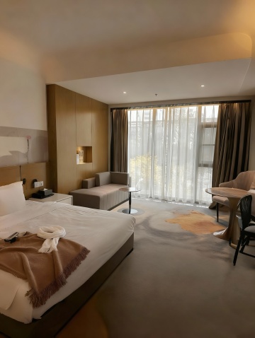 俯瞰视角,极简主义风格客厅以深邃的墨黑与温润的原木色为基调,倾斜45度的构图展现出几何切割般的空间层次感。清晨的冷蓝色光线从整面无框玻璃墙斜射而入,在深灰色微水泥地面上投下窗格的几何阴影,窗外是被薄雾笼罩的城市天际线剪影。中央悬浮着一个由黑色金属框架与烟熏玻璃台面构成的不规则多边形茶几,周围环绕着三张浅灰色模块式布艺单人沙发,每个沙发配有一个芥末黄皮质靠垫。右侧墙面是整面的胡桃木饰面板,内嵌线性LED灯带勾勒出隐藏式储物空间的轮廓。天花板采用悬浮式设计,中央垂挂着一个由12个不规则玻璃球体组成的艺术吊灯,在地面投射出破碎的光斑图案。空间角落摆放着一株大型琴叶榕,其深绿色叶片与整体冷色调形成鲜明对比。地面铺设着一块巨大的米白色羊毛手工编织地毯,边缘处有渐变的黑色几何图案。整体氛围呈现出一种冷静的奢华感,光线在不同材质间的反射创造出丰富的视觉层次,既保留了原空间的通透感,又通过色彩与光影的转变赋予其北欧极简的清冷美学。